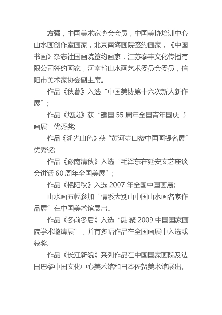 方强,中国美术家协会会员,中国美协培训中心山水画创作室画家,北京南海画院签约画家,《中国书画》杂志社国画院签约画家,江苏泰丰文化传播有限公司签约画家,河南省山水画艺术委员会委员,信阳市美术家协会副主席。